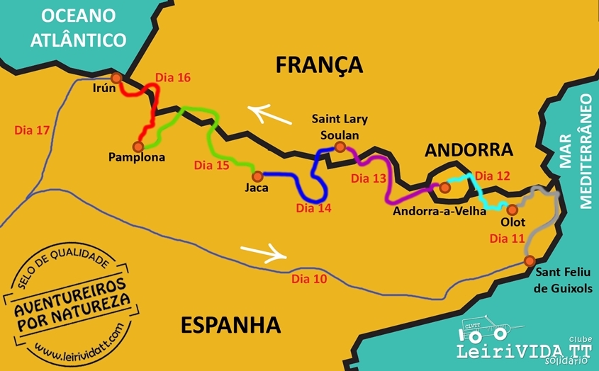 Este passeio terá o seu inicio em Vilar Formoso (ponto de encontro) com a etapa mais longa na ligação até à zona dos Pirenéus de Girona, junto ao Mediterrâneo. Seguem-se 6 dias de travessia da cordilheira, passando por alguns dos seus locais mais emblemáticos, como por exemplo Andorra, Saint Lary-Soulan, Jaca, Pamplona, até Irún, localidade espanhola banhada pelo Atlântico do golfo da Biscaia. O último dia está reservado para a ligação até Vilar Formoso e o regresso à casa, seguido de dois dias de fim de semana para recuperar energias.